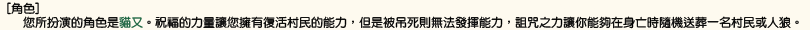 [村民的人口分配] 村子裡面有著特殊的能力者和思想異常的人存在。 以下就是村子的人口分配表。 ・希望村民勝利的人們 村民、占卜師、靈能者、獵人、共有者、貓又 ・希望人狼勝利的人們 人狼、狂人、小企鵝 ・希望妖狐勝利的人們 妖狐、背德、子狐、狐信者、小企鵝