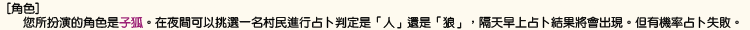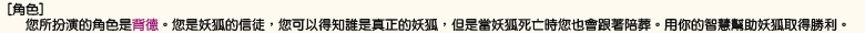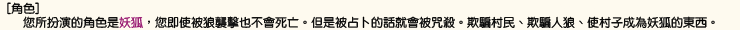 [勝利條件] ・村民的勝利 將人狼、妖狐和子狐全滅 ・人狼的勝利 殺死妖狐和子狐,並使村民的人數和人狼的人數相同或是更少。 ・妖狐的勝利 人狼全滅的時候、以及村民的人數和人狼的人數相同或是更少的時候,若妖狐或子狐存活就算勝利。 您是否存活下來並不是您玩這個遊戲的目的。 就算自己犧牲了,您的隊伍勝利的話則您也屬於勝利者。 | |||||||||||||||||||||||||||||||||||||||||||||||||||||||||||||||||||||||||||||||||||||||||||||||||||||||||||||||||||||||||||||||||||||||||||||||||||||||||||||||||||||||||||||||||||||||||||||||||||||||||||||||||||||||||||||||||||||||||||||||||||||||||||||||||||||