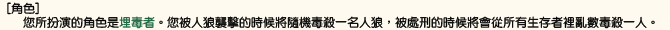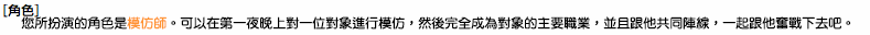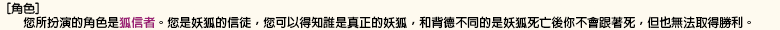 <參加遊戲時必須注意的事情> 「關於遊戲中的內容請不要在遊戲以外的場合進行討論。」 如果這樣做的話遊戲將會變得沒有意思了。 特別是當自己死亡之後把其他人的角色公開出來,請絕對不要有這種行為。 |