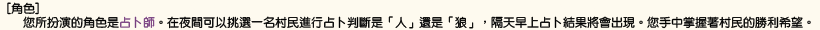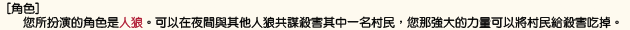 [遊戲前・生存中・遊戲後] 畫面分割的上面的部份是用來發言和投票用的。 下面的分割畫面是用來表示遊戲的內容。 右上角有[自動更新]可以指定下面的分割畫面自動更新的秒數。 [提示音效]是天亮的時候或是重新投票的時候、以及提出反退的時候出現的音效通知。 [↓清單]是將村民清單移到發言訊息的下面去。 反之[↑清單]是將村民清單移到下分割畫面的最上方。 右上的「提出反對」按鈕按下去的話會出現特殊的音效引起眾人注意。 「提出反對」按鈕的右邊括弧裡面顯示的數字是剩餘回數。從遊戲開始前算起只能使用 $maxcount_objection 次。 遊戲開始的時候下方的分割頁面表示的內容由上到下是: 「村名」 「剩餘時間」 「村民清單」 「自己的角色(和能力的結果)」 「發言訊息」 「死亡者表示」 「處刑投票的開票清單」 --實際顯示的「角色擔當(與能力結果)」--